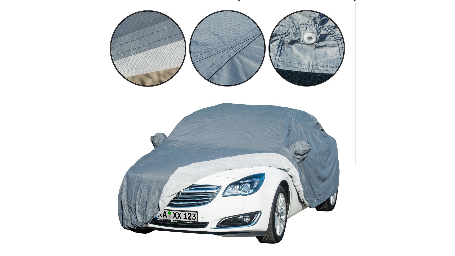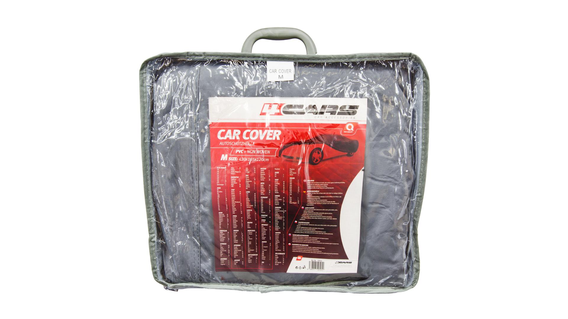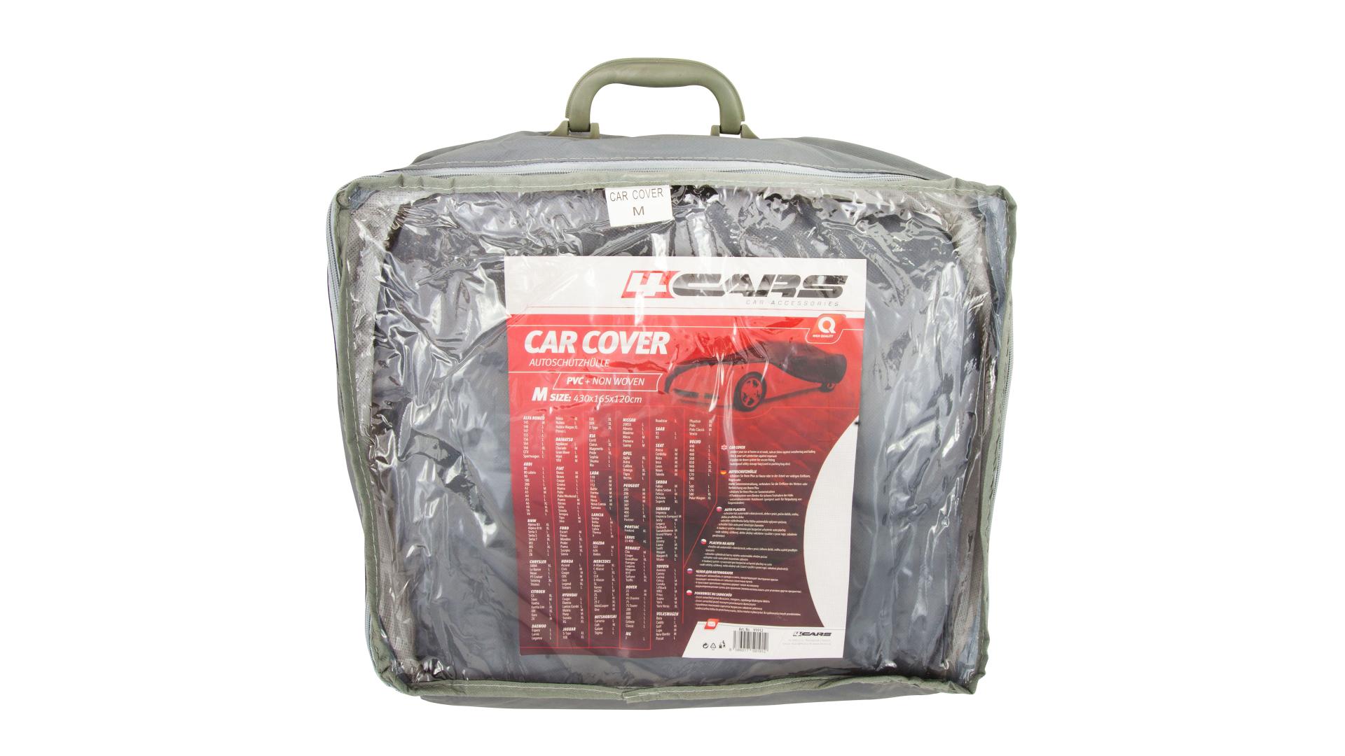 Autoplachta, veľkosť M, 430x165x120cm, odolná voči vode a UV žiareniu. Chráni vozidlo pred škrabancami, špinou a poveternostnými vplyvmi (dážď, sneh, slnko). Jednoduché použitie, bezpečné uchytenie so 4 bodovým systémom uväzovania. V taške na uskladnenie.