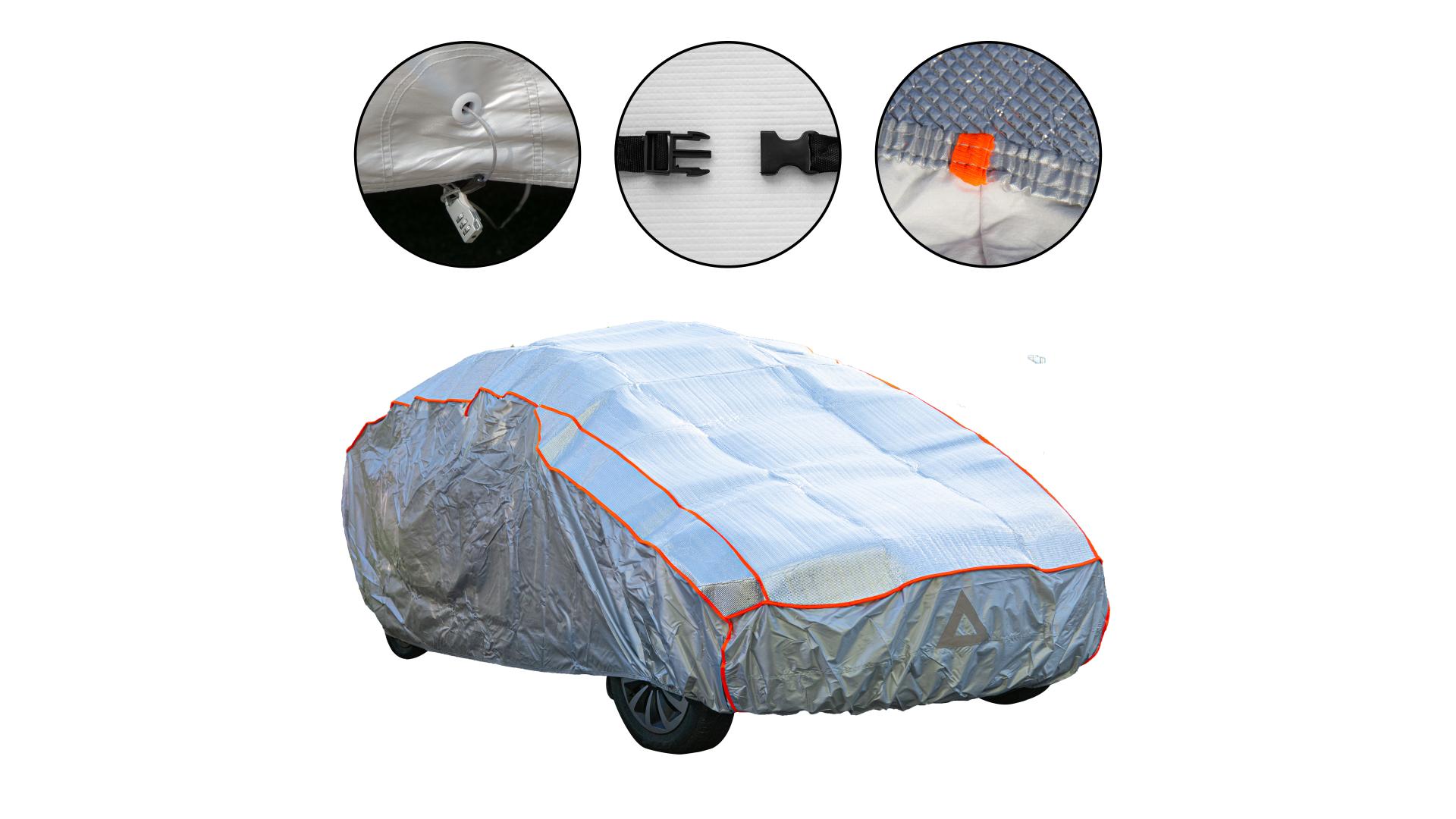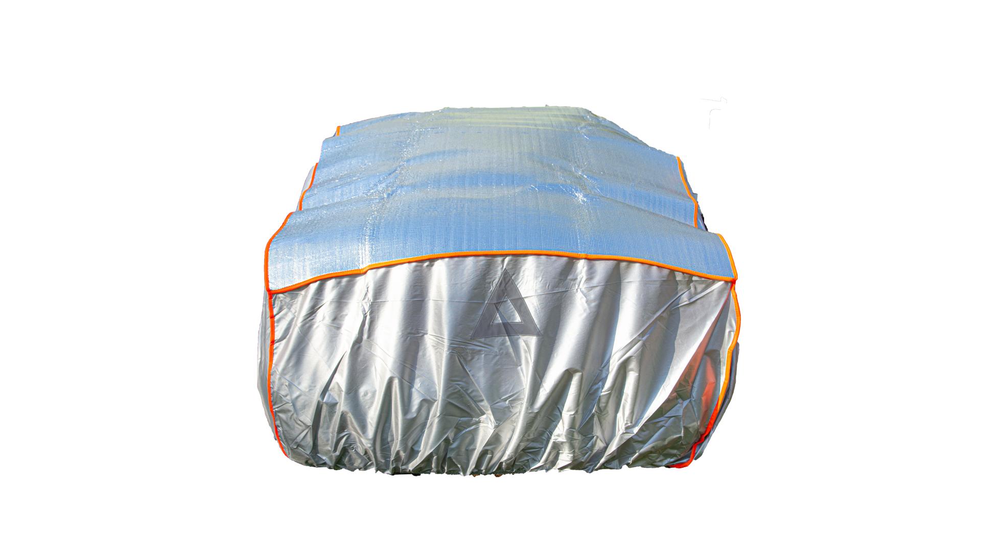 Vonkajšia časť plachty je vyrobená z kvalitnej reflexnej vrstvy, ktorá chráni vaše auto pred UV žiarením produkovaným slnkom a zvyšuje ochranu viditeľnosti vášho vozidla aj v noci, taktiež plachta chráni proti kameňom a krupobitím, poškriabaním, prachom a dažďom, snehom.
