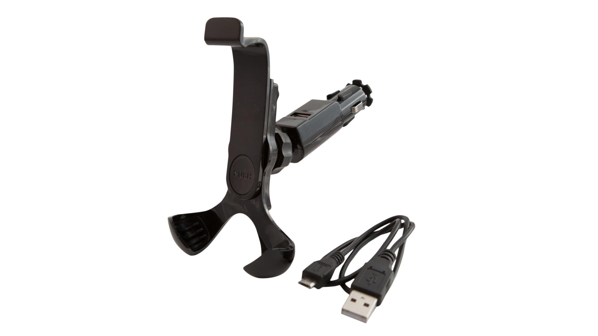 Držiak je otočný až o 360 stupňov, čo vám umožňuje nastavenie držiaka podľa vašej potreby. Balenie obsahuje okrem samotného držiaka aj zásuvku do zapaľovača a nabíjací kábel s USB konektorom.