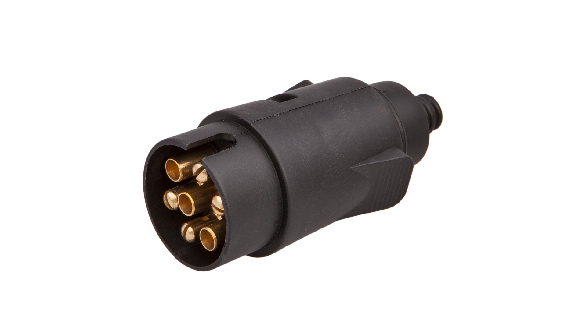Zástrčka na prívesný vozík z pevného plastu so 7 pólovým pripojením a 12V napätím. Zodpovedá DIN ISO 1724.