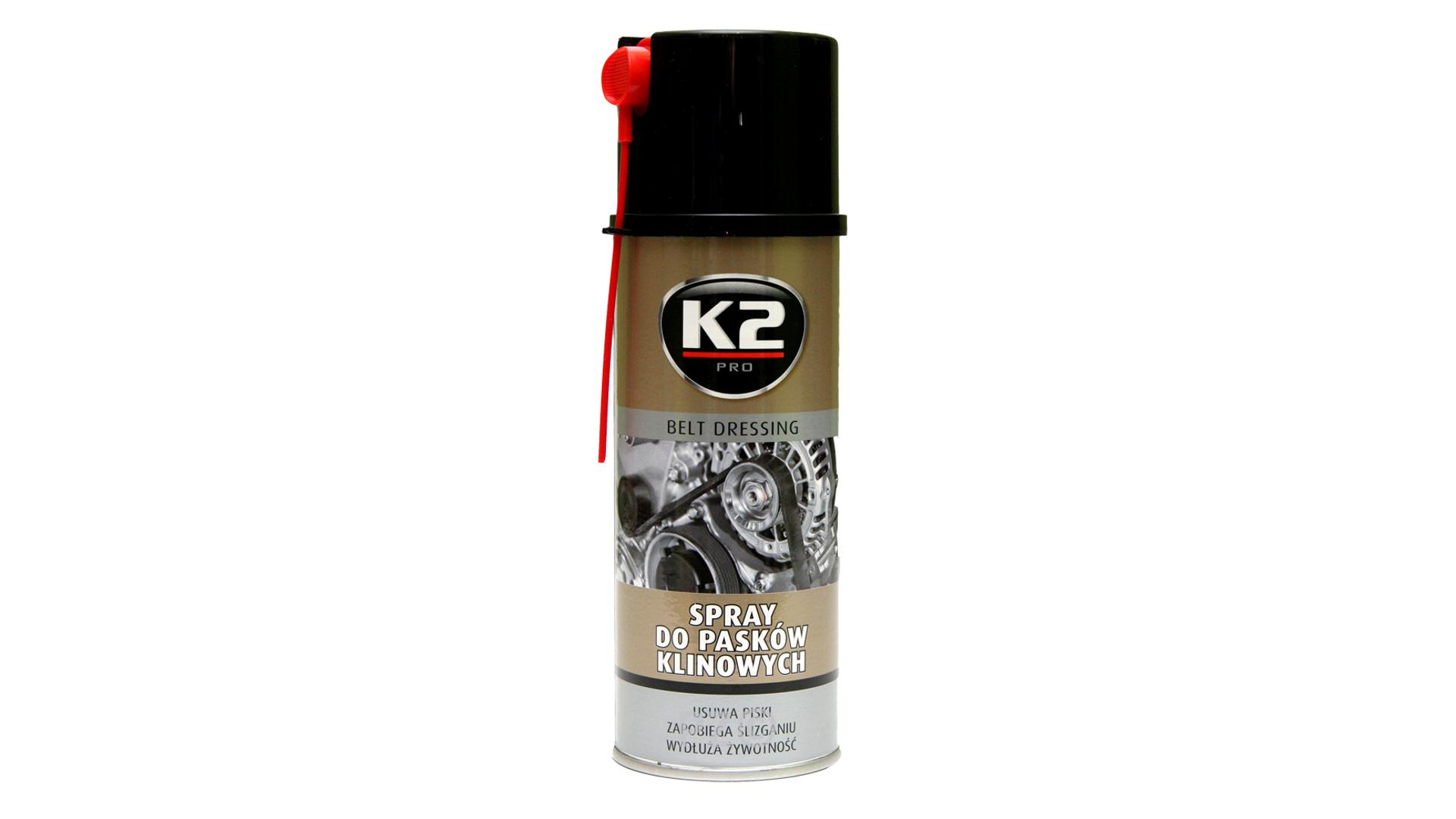 K2 BELT DRESSING, 400 ml, je prípravok na klinové remene, ktorý odstraňuje hluk, obnovuje pružnosť a chráni remene pred vysychaním čím celkovo predlžuje ich životnosť (využitie v osobných automobiloch, v nákladných autách, hospodárskych strojoch, domácnostiach atď.).