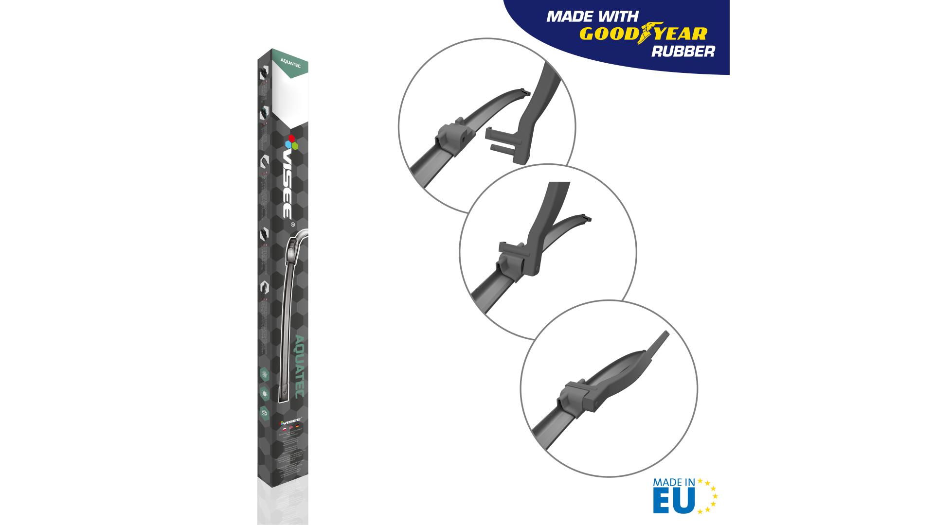 Stierače sú vyrobené z vulkanizovanej vysoko kvalitnej prírodnej gumy, obohatenej o aditíva, ktoré prispievajú k výnimočnej odolnosti voči UV žiareniu, striedaniu teplôt a tiež treniu. Vynikajúca trvanlivosť vďaka svojim nožom z kaučukových zmesí AQUATEC. Moderný dizajn stieračov prispieva k množstvu požadovaných vlastností ako napríklad nízka hlučnosť pri stieraní, vysoká aerodynamická efektívnosť pri vysokých rýchlostiach, stieranie po celej dĺžke stierača resp. okna. - Presná náhrada originálneho stierača, s kovovým upevnaním k ramenu - Gumičky značky GoodYear - Sada - ľavý predný a pravý predný stierač - Top kvalita prevedenia - Grafitové Gumičky s dlhotrvajúcim účinkom do každého počasia - Vysoko odolné voči mrazu